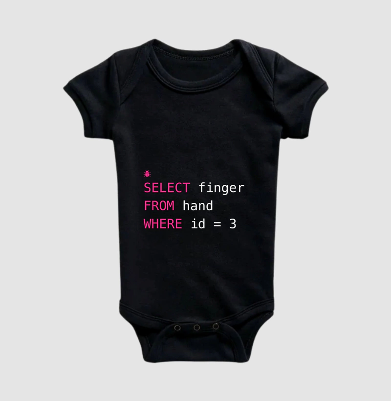 Este Body Infantil \"SELECT finger FROM hand WHERE id = 3\" é perfeito para aqueles bebês que cresceram ouvindo papai e mamãe programadores falando em código - e que um dia vão entender que existe uma forma elegante de expressar frustração.